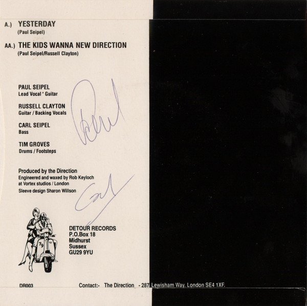 DR003 was Lewisham based The Direction’s second single, the double A-sided Yesterday / The Kids Wanna New Direction, and their only release on Detour. Tania ? joined Detour Records and handled the business side of the label / mail order sales (not Holmes’ forte), while Holmes focused on the records.