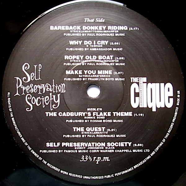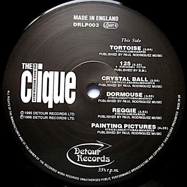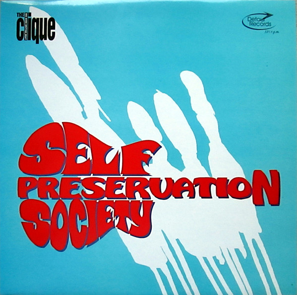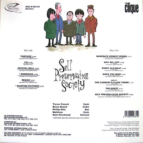 In ’95, Philip Otto (bass), Trevor French, (vocals), Dom Strickland (organ), Bruce Brand (guitar) and Matthew Braim (drums), the five members of London based mod psych band, The Clique released The Self Preservation Society [DRLP003]. This was the band’s first and last studio album, after eight years as a unit. Engineered and produced by Liam Watson, part of it was used on The Big Breakfast. Selling over 5000 copies, with artwork by Dom Strickland, it is Detour’s best seller and saw The Clique showcase for the One Little Indian label. Mark Lamar would later have them do a Live in Session slot on Radio 1 on Mark Radcliffe’s evening show and he wrote the sleeve notes for the farewell single released on Detour in ’98.