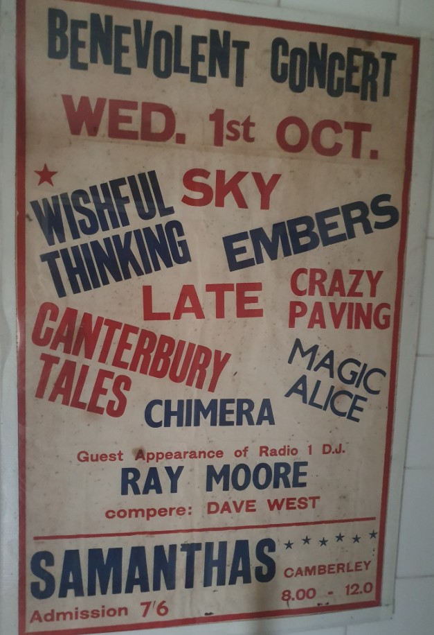 On 1 October ’69, Magic Alice were one of the many bands, including Sky, Wishful Thinking, The Embers, The Late, Canterbury Tales, Chimera, and Crazy Paving that played a benevolent concert at Samantha’s Club, as the Agincourt Ballroom, Camberley was called for a time. This was compered by Dave West and also featured the Radio 1 D.J. Ray Moore.
