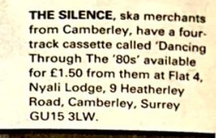 Based out of a small flat in Nayli Lodge, Camberley; The Silence produced a four-track SKA demo titled Dancing Through The ’80s; which received a listing in the 14 December ’85 issue of Sounds.
