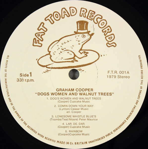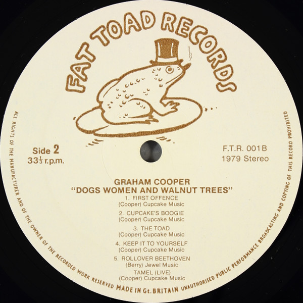 In September ’79 Cooper entered Chestnut Studios, Churt and ably assisted by Greg Terry-Short on drums and fellow Soho member Terry Campbell on bass, who split those duties with engineer Tim Wheatley, recorded nine rock and blues tracks, including Cupcakes Boogie. There were also backing-vocals provided by Tammy and Teri Collins on the title track, with the Bloodhound‘s Mick Hogsden, along with Greg Watkins and Terry-Short doing the same on Lar-De-Dar. These would be released as the solo vinyl LP: Dogs, Women and Walnut Trees on Fat Toad Records [FTR001]. There were also two bonus tracks on the B-side: Rollover Beethoven and Tamel recorded live with The Jackie Lynton Band and the Golden Lion, Fulham on 18 November ’78.