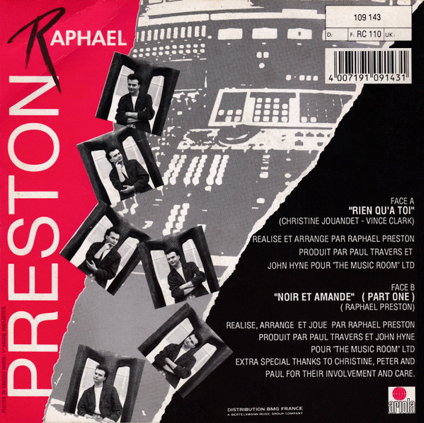 In the UK, Raphael Preston is better known as an audio engineer, most notably from ’77 to ’84 at Nemo Studios, London with Vangelis. But he also recorded music himself, including the 7″ single Rien Qu’à Toi. , This cover of Yazoo’s Only You, with French lyrics, was recorded at The Music Room and produced by Travers and John Hyne before it was released by Ariola [109 143] in France in ’87.
