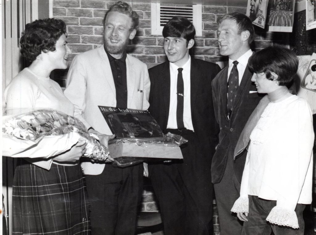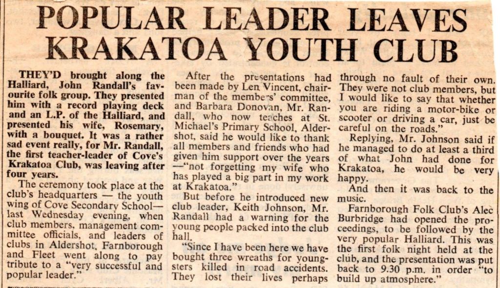 All five members of Farnborough covers band Big G and the Go-Gets attended Cove County Secondary School and played regularly at the Krakatoa Club in ’64/’65. John Randall, the popular leader of the club, left in ’68 with an event that featured his favorite folk group The Halliard, supported by Alec Burbridge of Farnborough Folk Club. Randall wass presented with a copy of The Hilliards LP “It’s the Irish in Me” and a record player on leaving.