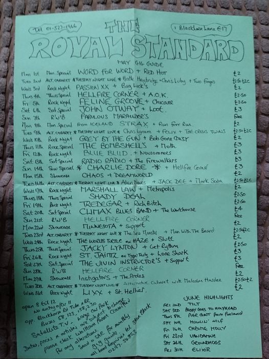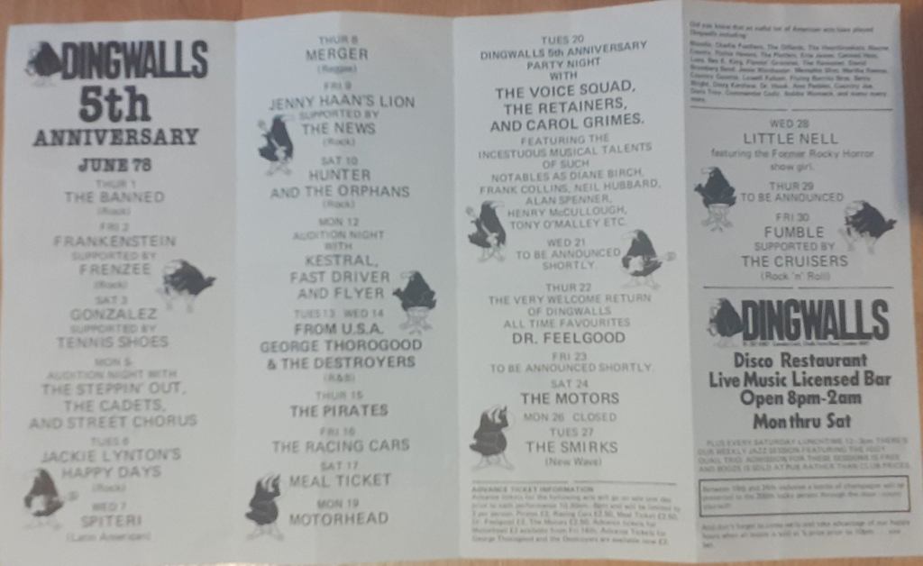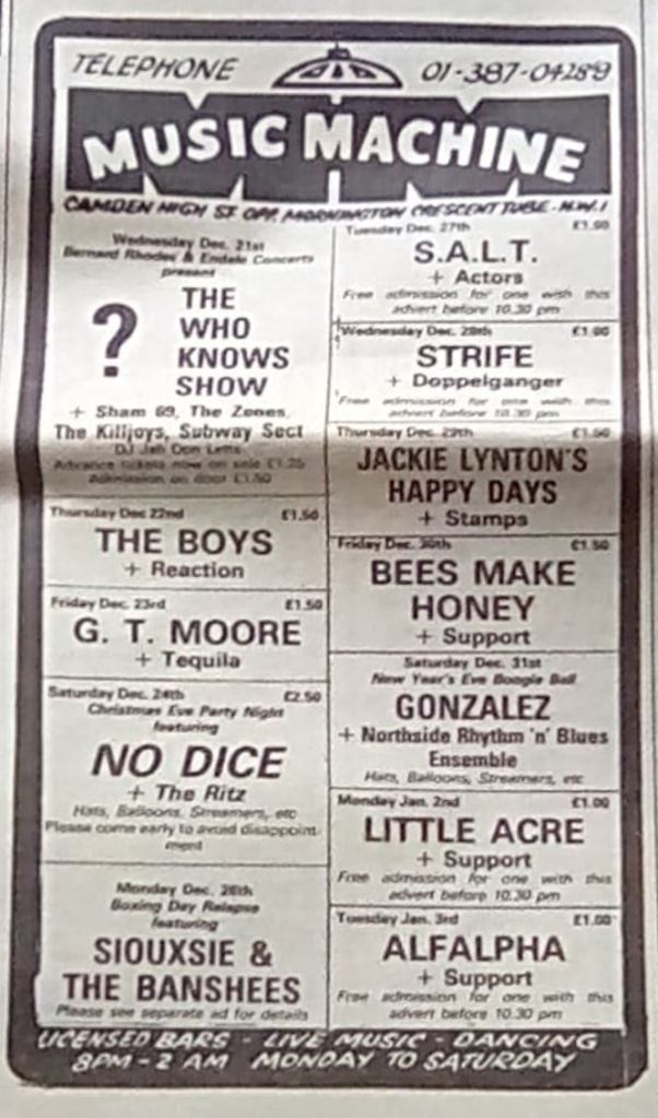 That’s a Headwaiter poster (featuring girlfriend) on Terry Murphy’s office wall c’78/’79. Murphy was the landlord, of Bridge House, Canning Town and owner of Bridge House Records. Managed by David Simmons and represented by Joe Slattery of the NEMS Agency Ltd, they did not record or release an album or single, although some songs were recorded, but are now lost in the mists of time. They were offered a couple of album deals, but hung out for a better offer that never came. Three tracks did appear on the Guildford band compilation titled “Who Invited Them?” on the local Thumb label. “Who Invited Them” was recorded in summer 1978, by which time the band had pretty much stopped gigging. They played a few final contracted dates in the autumn of ’78, but without Sandy Davis on drums. The band folded after their last gig in ’78.