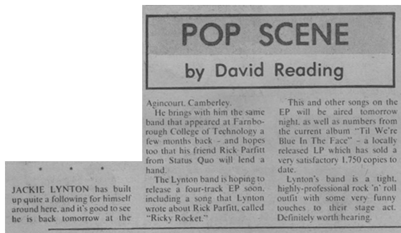 2 May 1965: Gig List Advert. Source: www.bradfordtimeline.co.uk Aldermaston Marchers, Art College, Bill Wyman, Bob McGarth, Brian Chambers, Cafe Cantata, Creole Records, Cyril Davis All Stars, David Brown, Eyeball Productions, Farnham, Gary Farr and the T-Bones, Group 3 + 1, Guildford, H.S. Rupert & his Soul Builders, Hog-Snort Rupert’s Famous Porkestra, Hogsnort Rupert, Hogsnort Rupert and his Band, Hogsnort Rupert's Good Good Band, Ilkley, Ilkley D.J. Club, John Claydon, John Constantine, John Ford Combo, John Mansfield, John Platt, John Renbourn, Johnny Guitar Watson, Kingston College of Art, Larry Williams, Long John Baldry, Mann-Hugg Blues Band, Marquee, Merrow, Mick Wayne and his Band, Mick Wayne and Ork, Milton James, Nigel Enever, Pentangle, Peter Stringfellow, Radio Luxembourg, Reading, Ready Steady Radio, Ricky Tick Club, Ripley, Rod Jones, Roy Tempest, Sheffield, St John's Ambulance Hall, The Famous Porkestra, The Mojo Club, The Pretty Things, The Rolling Stones, The Stormsville Shakers, Tony Hoadley, Transatlantic, Troutbeck Hotel, Village hall, Windsor -