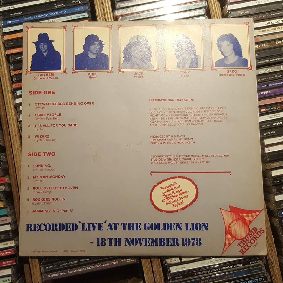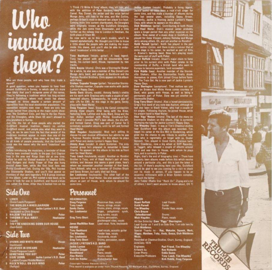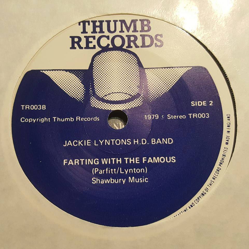 Their first release was TR-001, a various artists LP entitled ‘Who Invited Them?’ in ’78 that featured four Guildford bands: Headwaiter, House, Poker, and the Jackie Lynton H.D. Band. The Jackie Lynton H.D. Band were also responsible the labels next two releases. The LP, ‘Till We’re Blue In The Face’ (TR-002) in ’79, which was released in two version, the more collectable featuring blue vinyl. This LP release was accompanied by TR-003, the bands 7″ titled ‘Dan (The Hedgehog Song)’, and Thumbs’ only single. The ‘B’ side, ‘Farting With The Famous’, was co-written by Rick Parfitt, of Status Quo.