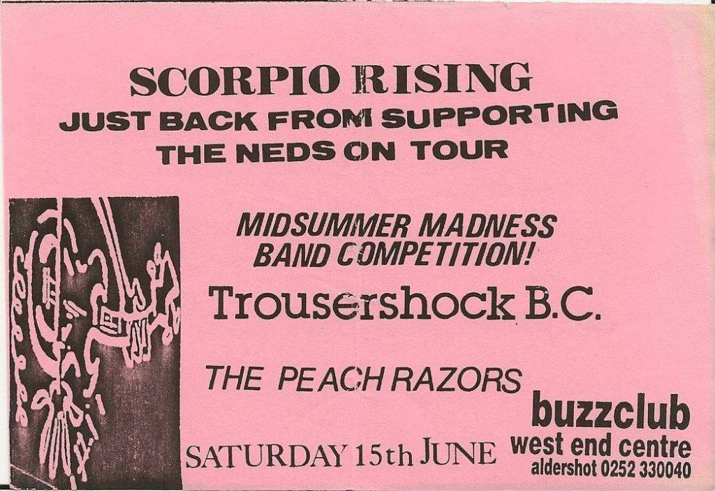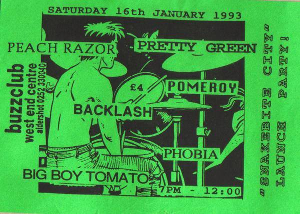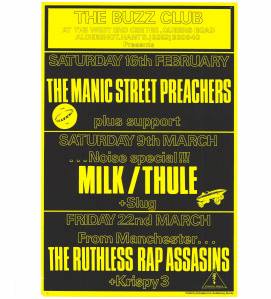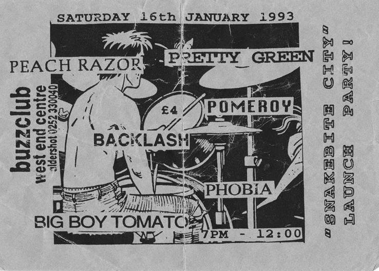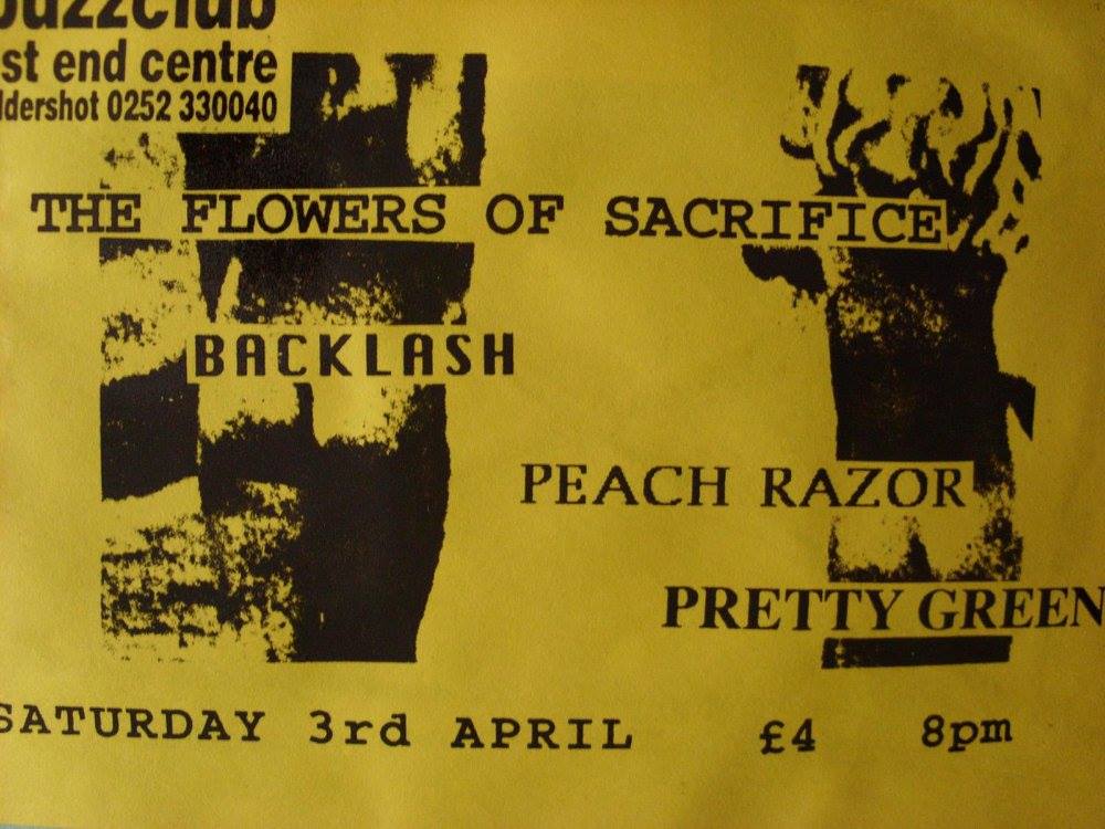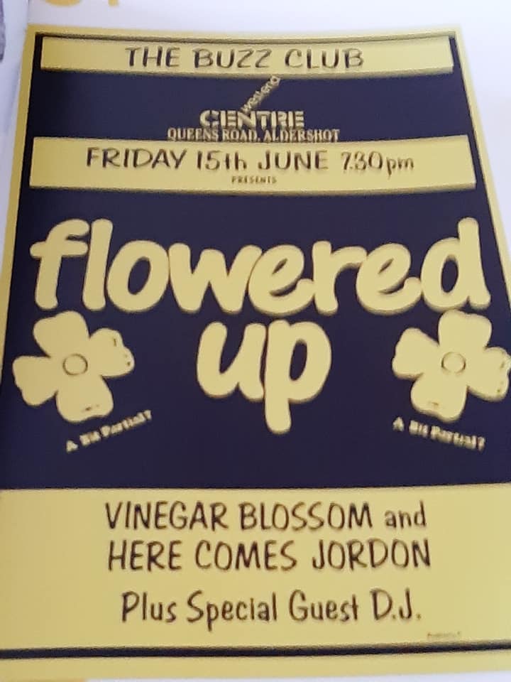 But, before that The Vinegar Blossom’s second gig saw them supporting The Charlatans at The Buzz Club at the West End Centre, Aldershot. This was also the night that the band had asked Danny Hagan to manage them and The Charlatans asked Vinegar Blossom if they’d support them on a few dates later in the year. On the 29 May the band played the first of three dates with The Charlatans at Portsmouth Polytechnic, the next night they were at the Bierkeller, Bristol and on 1 June they supported at the Nelson Mandela Building, on the University of Sheffield campus. This was also the year they were supposed to support Flowered Up, with Here Comes Jordan, at The Buzz Club on 15 June. Flowered Up cancelled and Eusebio stepped in to headline.