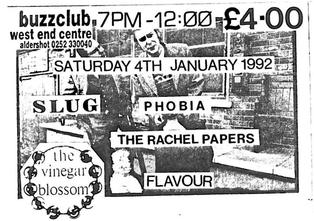 A local band night at the Buzz Club saw The Vinegar Blossom take to the stage with Slug, Phobia, The Rachel Papers and Flavour on 4 January ’92. Then on 28 March ’92 the band entered the Echoey Groove Studio at Bracknell Arts Centre and recorded a live demo which included “Don’t Go Raising Your Spirits Around Here”. It’s unclear if this was before or after the Andreas Hering compiled the “Everlasting Happiness” compilation cassette that included the band’s “Solstice”. After spending 16 months compiling the cassette, Hering released it in Germany sometime in ’92.