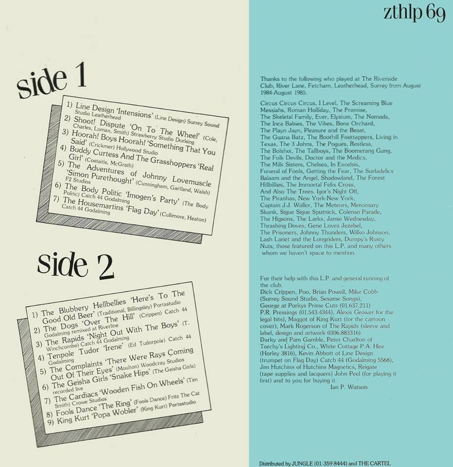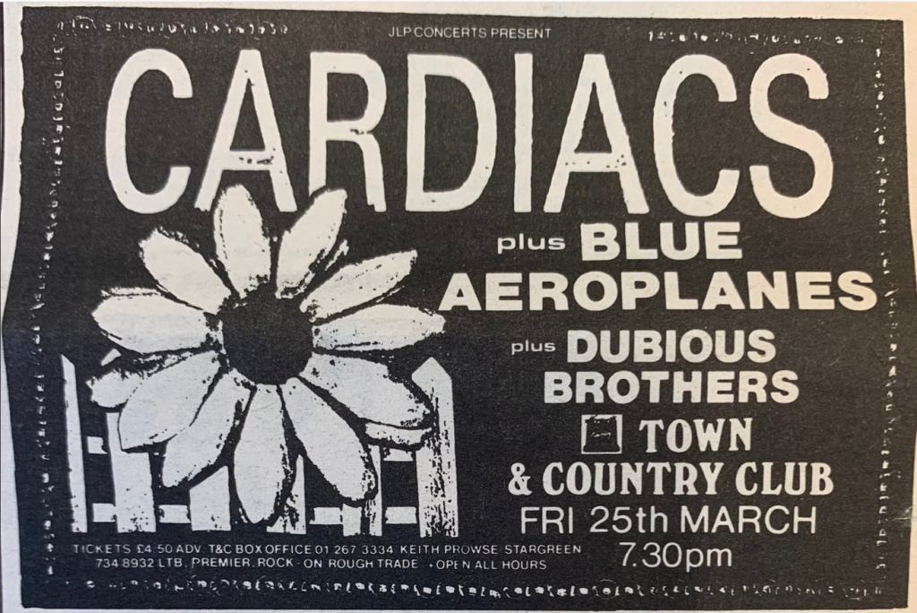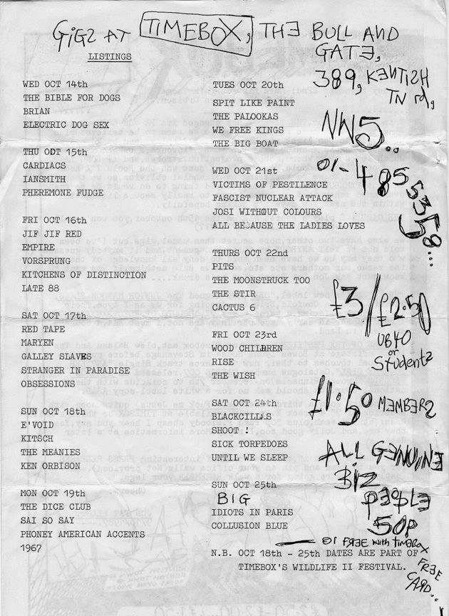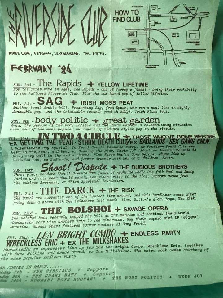 Screaming Lullibies supported In Excelsis, with No Joy and COW at the Old Schoolhouse, Woking on 26th April 1984. While not listed The Spin Dolls appeared too. Picture courtesy of Sharon Pilling.