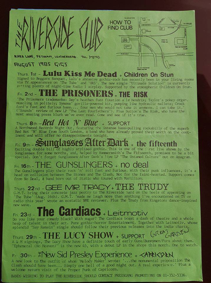 Screaming Lullabies at The Royal, Guildford Pilling & Kelly had previously been in a band with Alison Goldfrapp called Creatures of Darkness, who played in and around the Guildford area, before forming Screaming Lullabies with the others in ’83. With members mostly from the Guildford area, they played at the Old Schoolhouse, Woking several times and at various other local venues, including The Royal, Guildford, and were often compared to Bauhaus – who they cited as an influence along with Death Cult and The Birthday Party. Their Schoolhouse appearances included a support slot; with No Joy, COW, and The Spin Dolls, for goth rock band In Excelsis, formed by former UK Decay guitarist Steve Spon, on 26 April ’84. Three months earlier. on 14 January ’84, Screaming Lullibies had headlined at the Old Schoolhouse, with Dark Paradise, COW and The Spin Dolls in support. The band split shortly after the In Excelsis support gig.